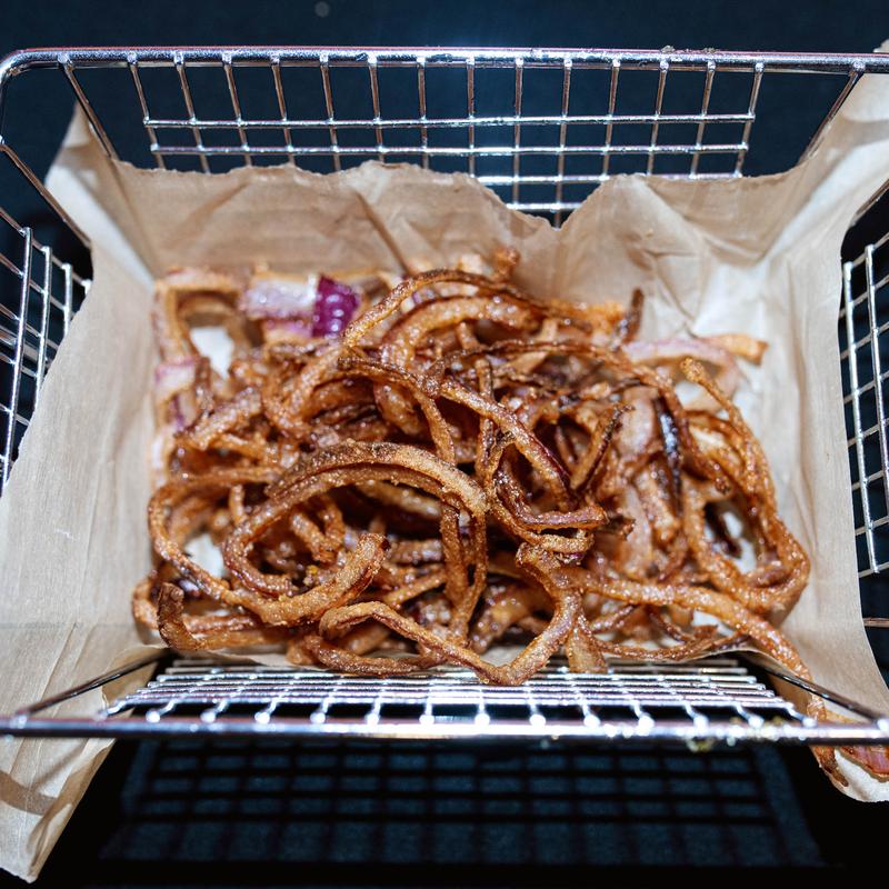 A generous pile of thinly sliced onions, and tossed in a light, seasoned flour dredge. Fried quickly to a delicate, golden crisp.