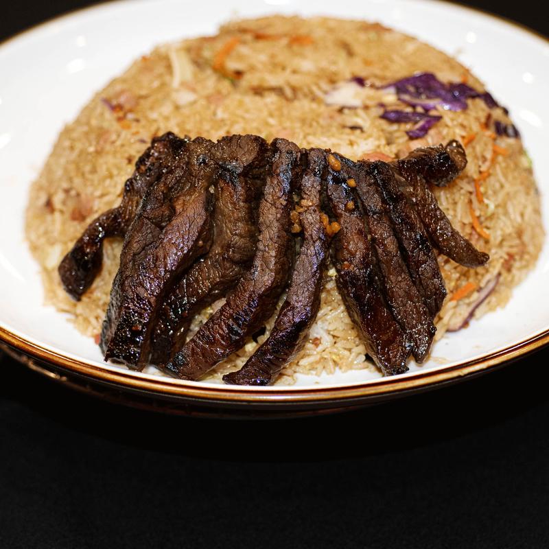 Six Ounces of Thinly sliced, tender beef sirloin marinated overnight in a signature marinade, allowing for a hint of sweetness, and a tangy finish. Pan-fried until the edges are perfectly caramelized, and served on top of steamed white rice. (pictured with the upgrade option of fried rice)